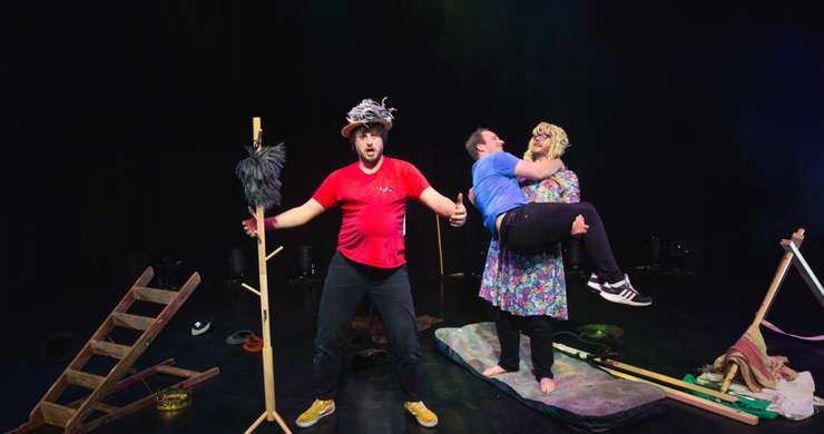 On stage, the performers attempt to recreate Shakespeare’s tragedy using a deliberately stripped-back aesthetic that includes second-hand costumes, everyday objects and minimal set. The approach combines extracts from the original text with clowning, slapstick and direct engagement with the audience.